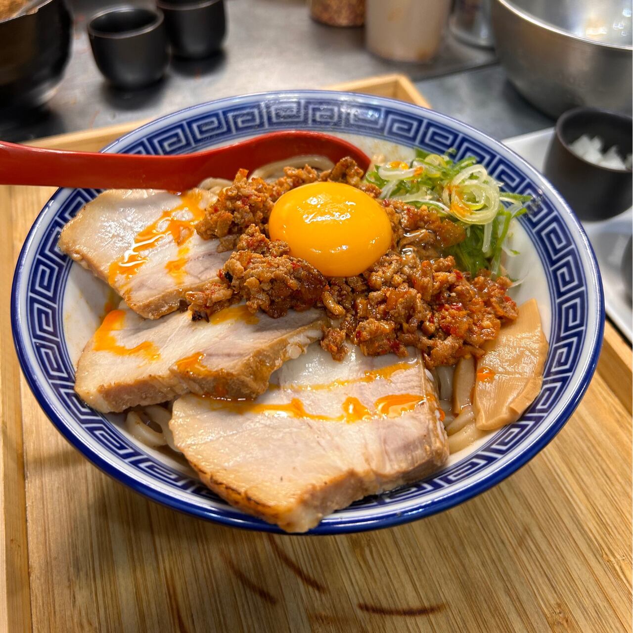 麺は力強い太麺の特注麵で、店舗では7分茹でございます。